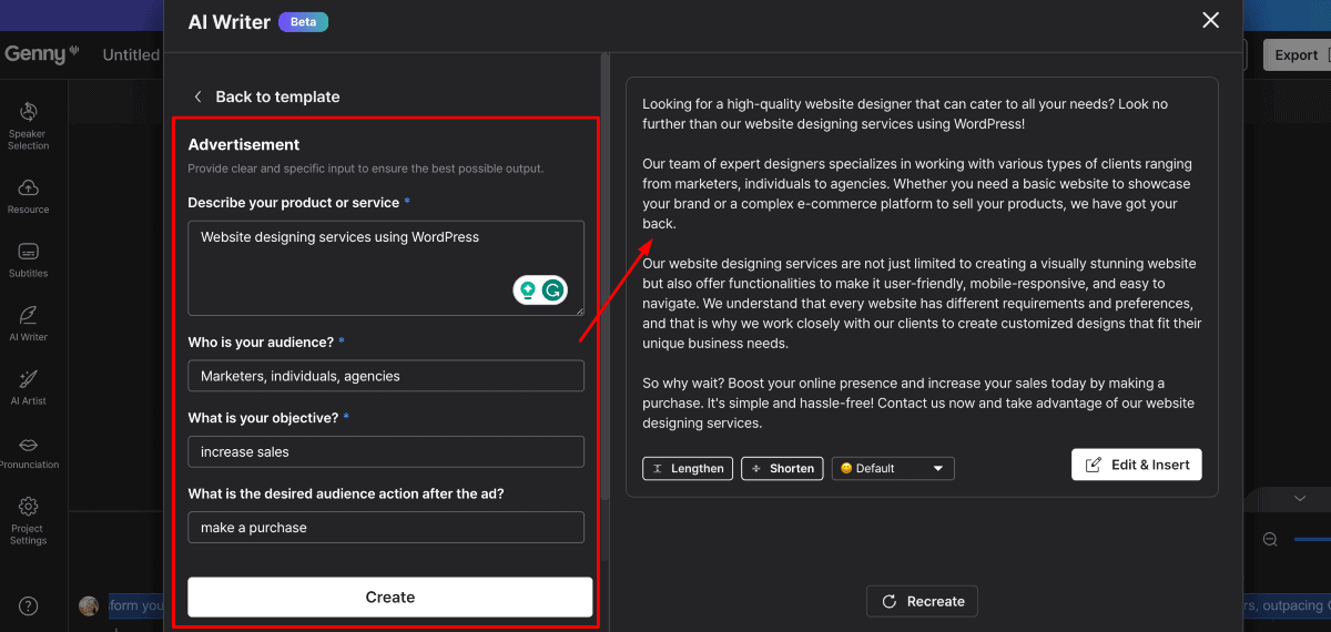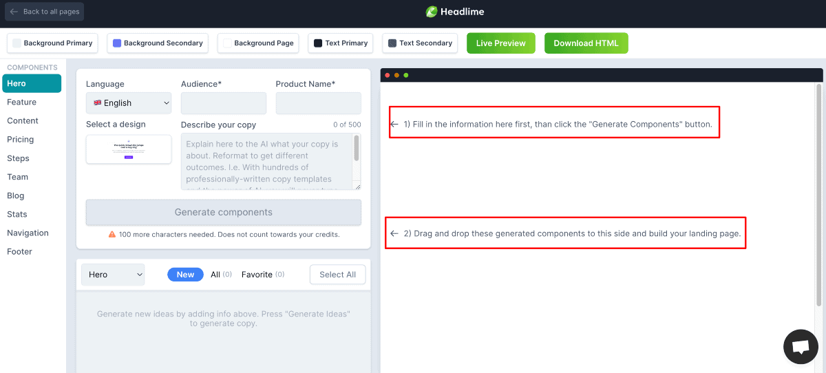 Once you describe your copy and click on “Generate Components,” you will get the result in the section below that.