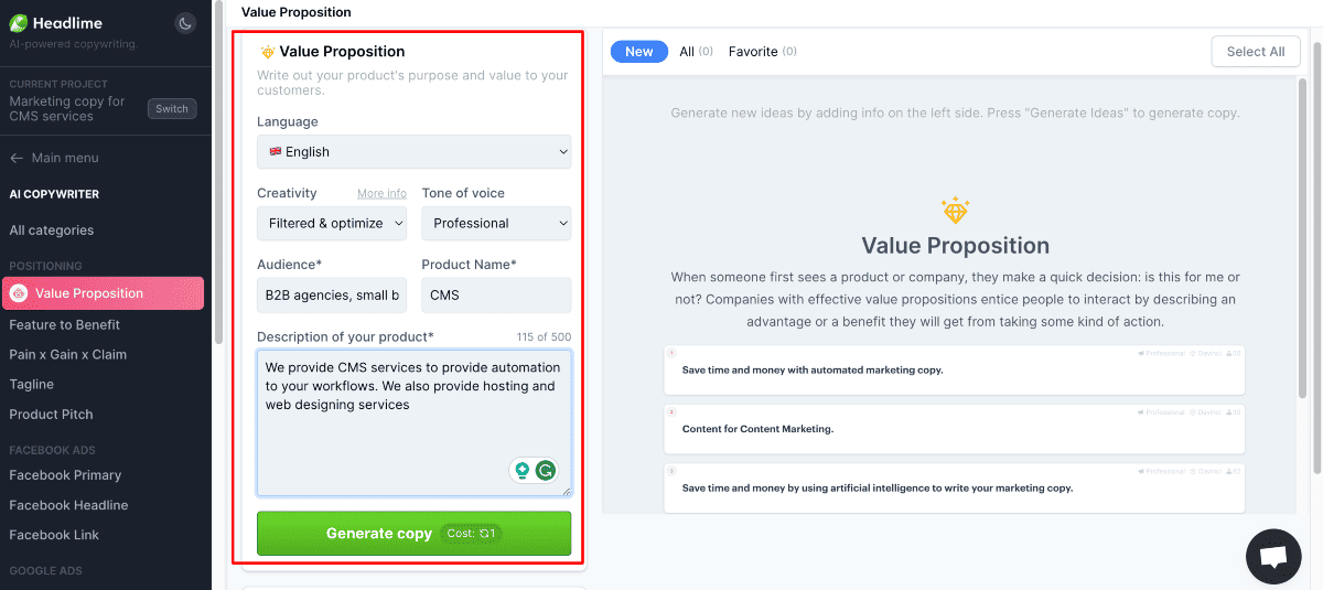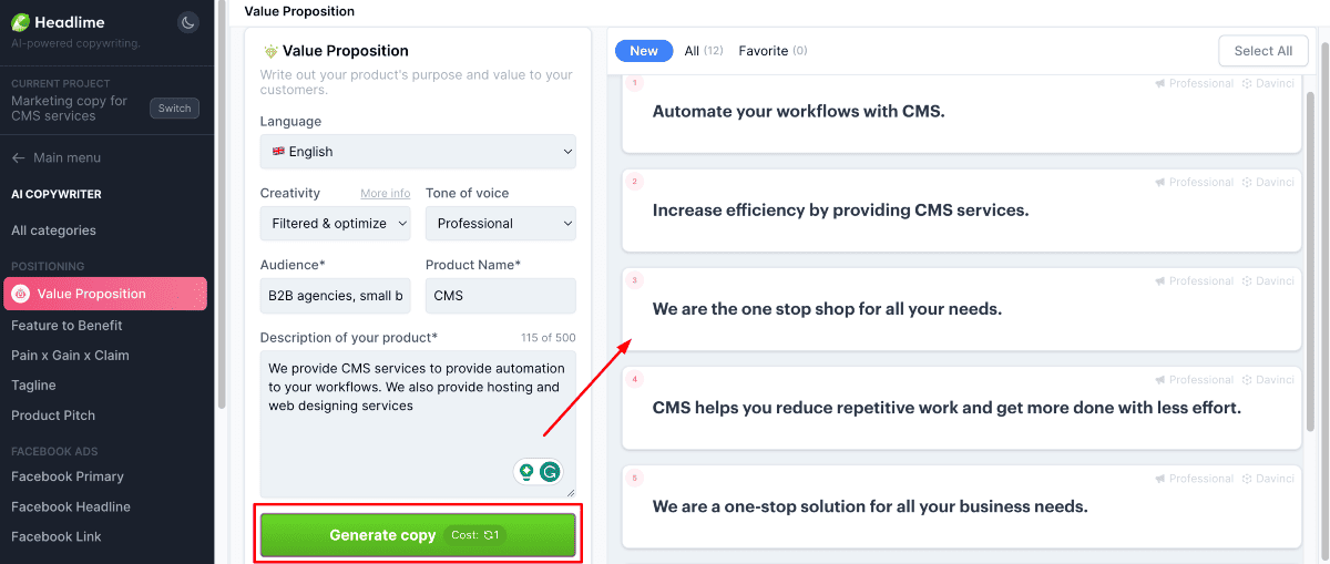 Once I gave the details and clicked “Generate Copy,” I got variant value propositions.