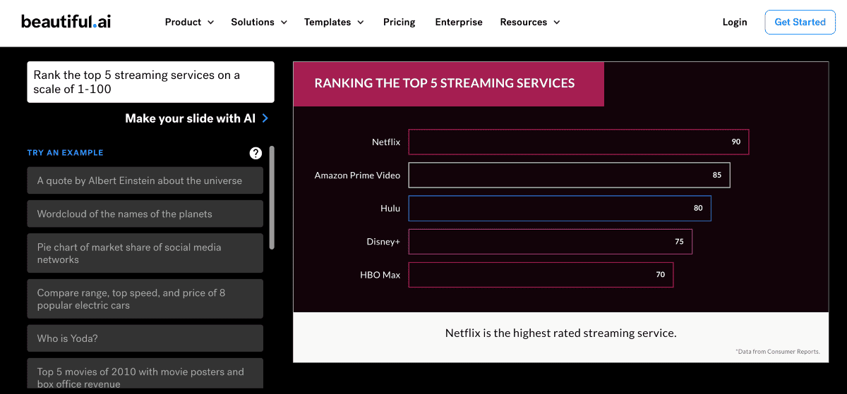 Beautiful.ai simplifies the process of creating compelling charts and graphs. The tool can convert raw data into appealing visualizations.