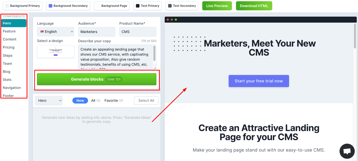 The landing page components are shown toward the left side of the interface. I selected the component, described the copy, and clicked on Generate blocks.