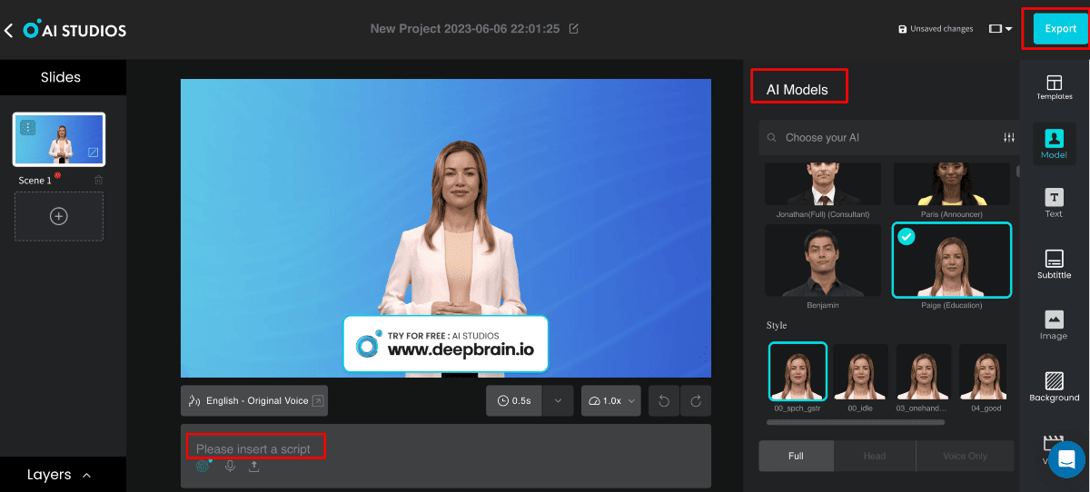DeepBrain enables users to add voiceovers, music, and text overlays effortlessly. It enhances the overall quality of the videos. DeepBrain empowers creators to unleash their creativity and deliver compelling videos, from marketing campaigns to educational content.
