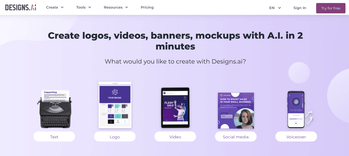 - Design.ai – Design.ai is a game-changing AI video generator. It empowers users to create logos, videos, banners, mockups, and more with incredible speed and efficiency.