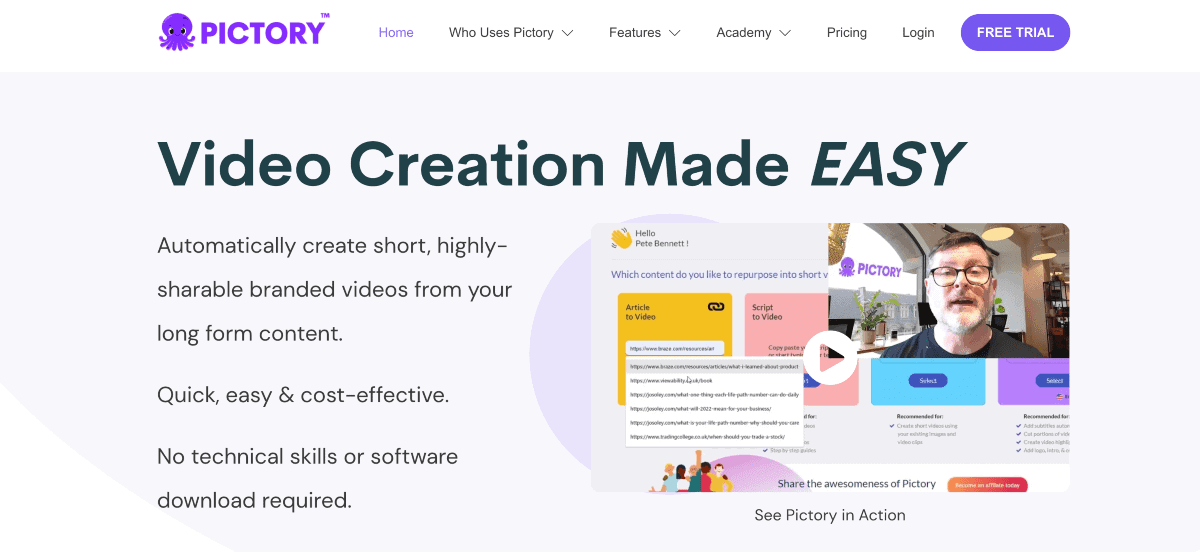 It then converts them into dynamic videos with AI. Whether for marketing campaigns, social media content, educational purposes, or personal projects, Pictory enables users to bring their visions to life with minimal effort.