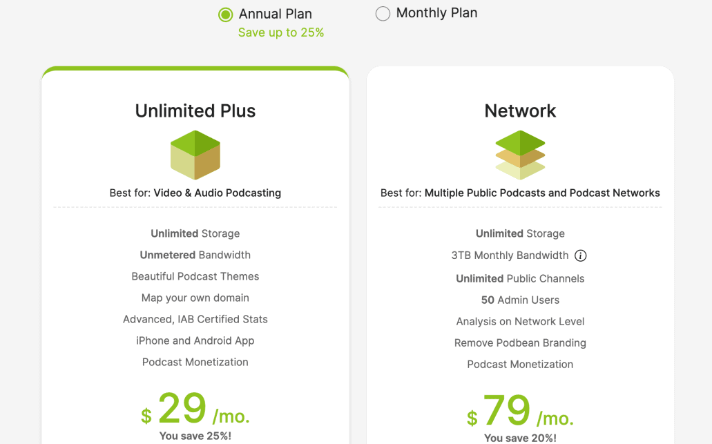 What differentiates the unlimited plans includes video podcasting and the number of admins. However, the PodBean Black Friday Deal applies to them all. This gives a 25% discount on all the plans.