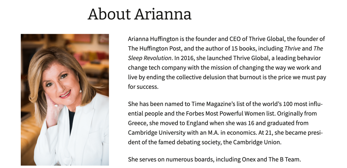 In 2016, Arianna Huffington founded Thrive Global, a wellness and behavioural change company headquartered in New York City.