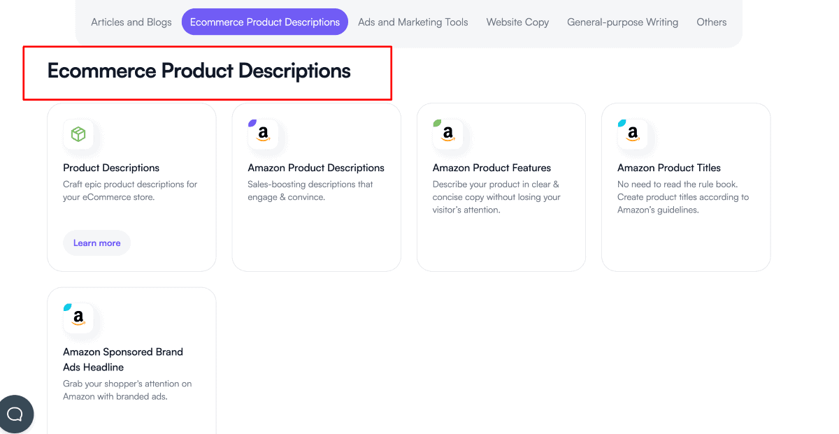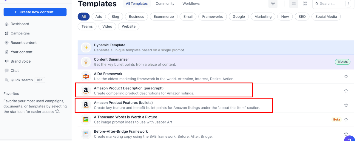 Jasper also has specific templates for Amazon product descriptions and Amazon product features. The image below highlights both the templates.