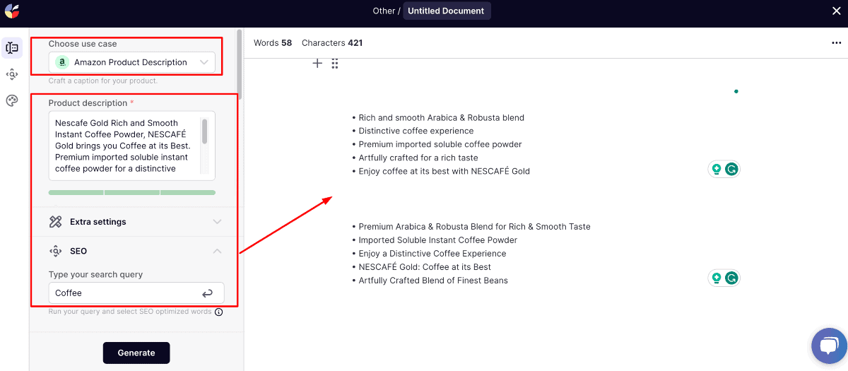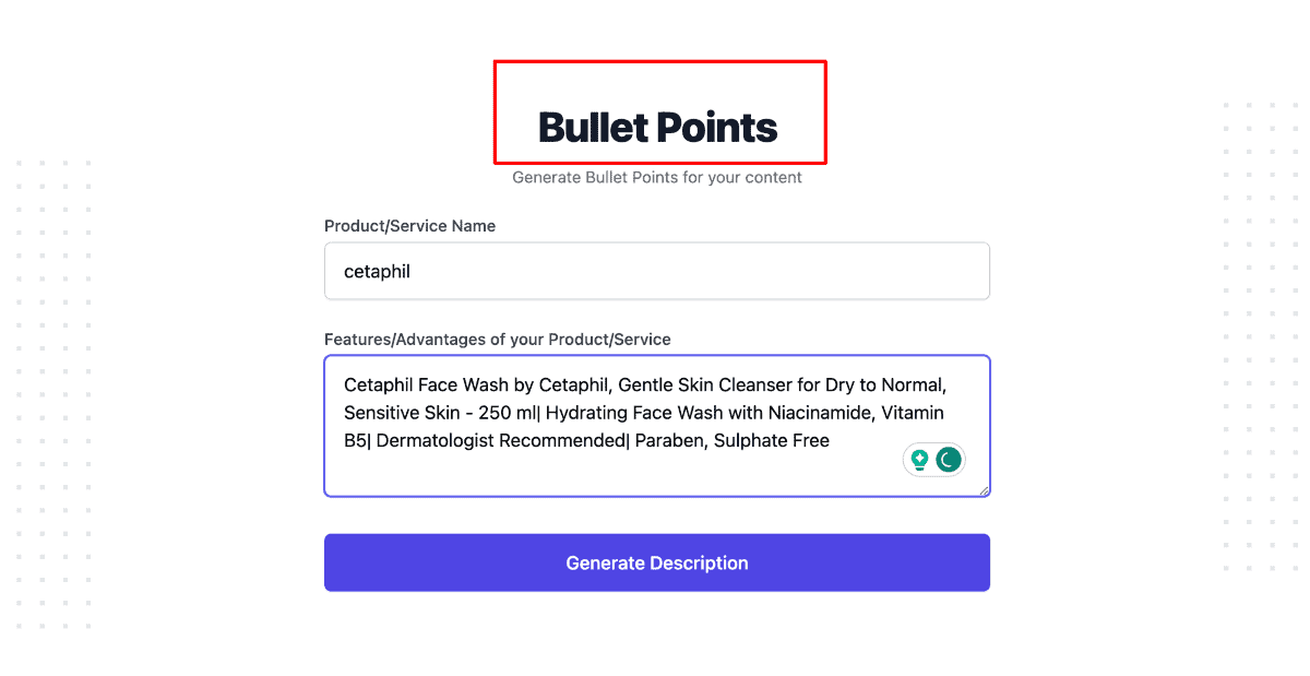 I also tried a bullet point description template. Again, I followed the same process and clicked on Generate Description button. Refer to the image below.