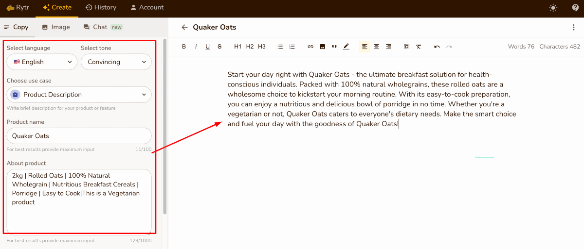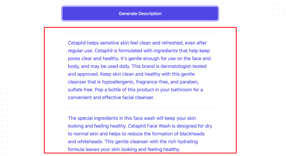 Firstly, I tried the Product Description template. The below image shows the generated copy when I gave the product name.