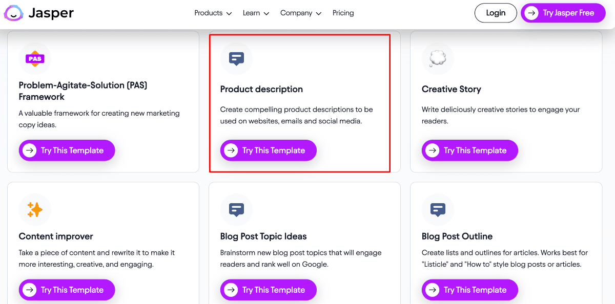 - Jasper AI revolutionizes e-commerce and marketing industries with its Product Description template.