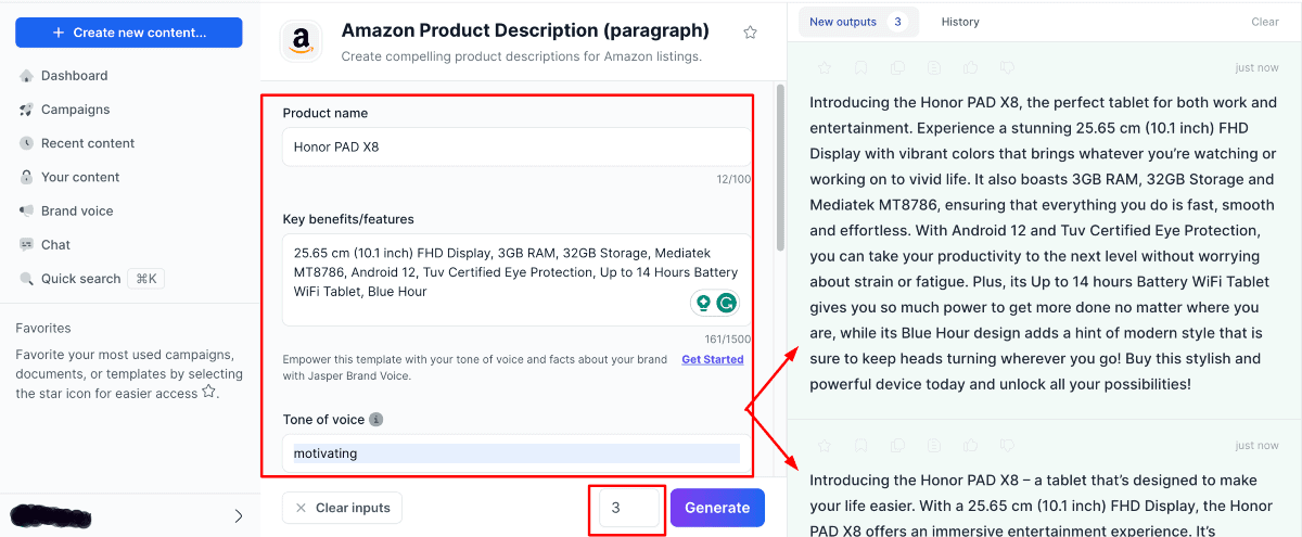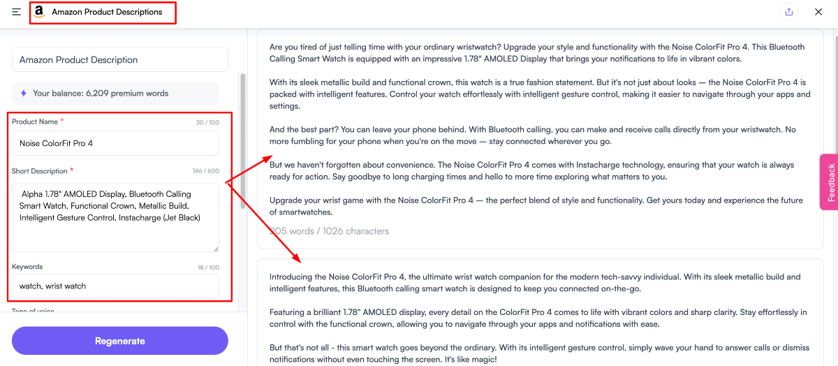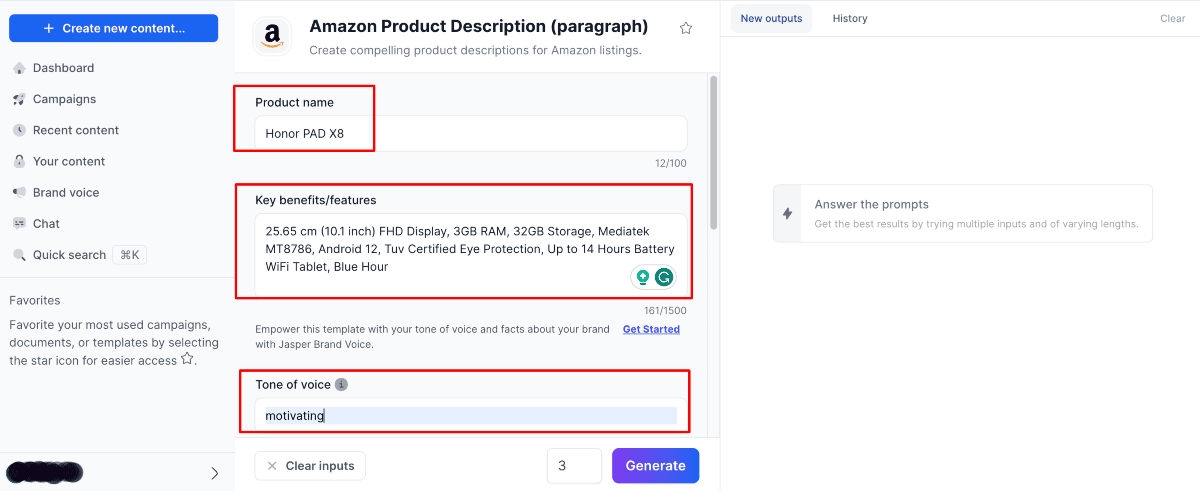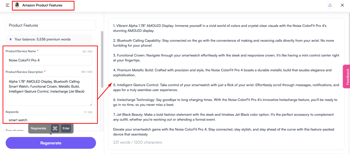 I chose the Amazon Product description template. The below image shows that I have given the Product name, feature, and tone of voice.