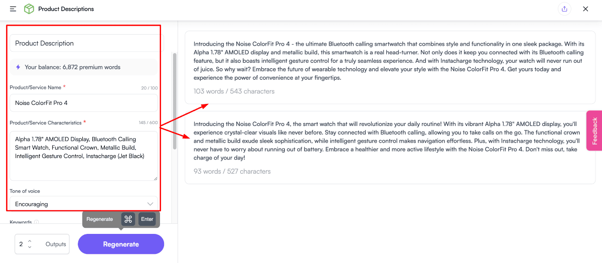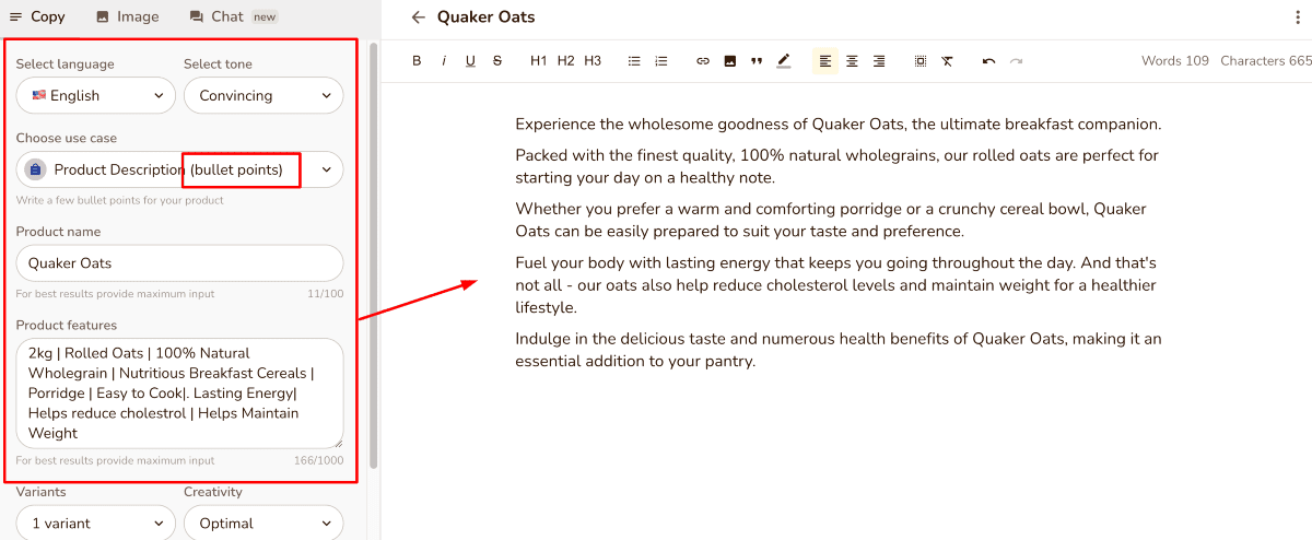 Now, I have used the Product description Bullet Points template in the image below to get the copy in bullets. The tool did not actually give descriptions in bullets, but it has changed the paragraph for every point.