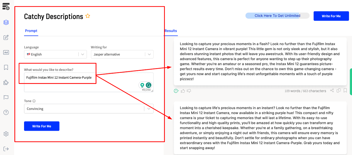 Save yourself from the hassle of manual writing and let Writesonic do the heavy lifting. Get ready to witness your conversions skyrocket with Writesonic, your trusty product description sidekick.