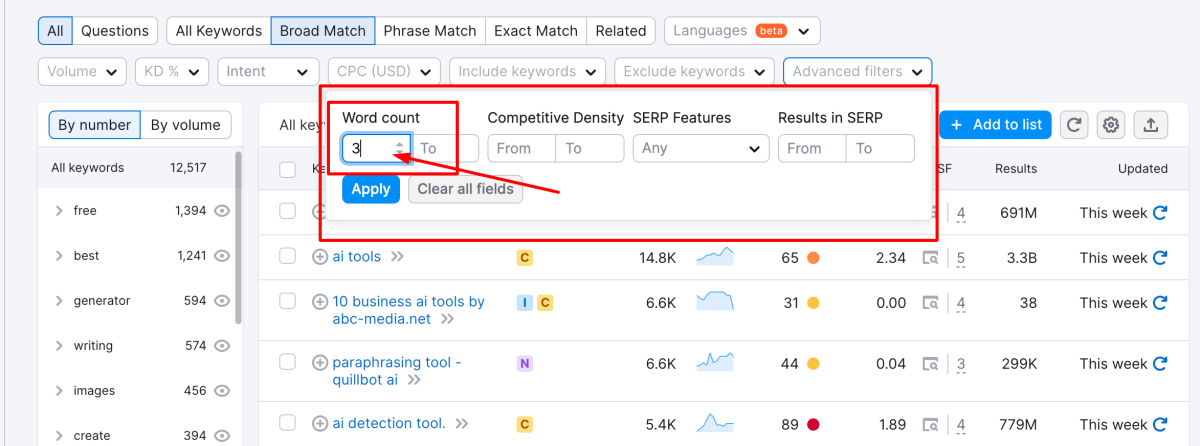 Set the “Word count” filter to a lower range of “3” or more. As long-tail keywords typically have three or more words, we did so.