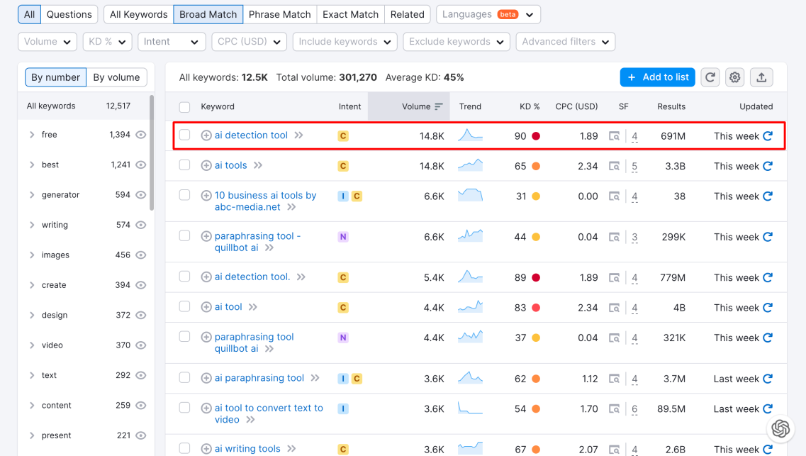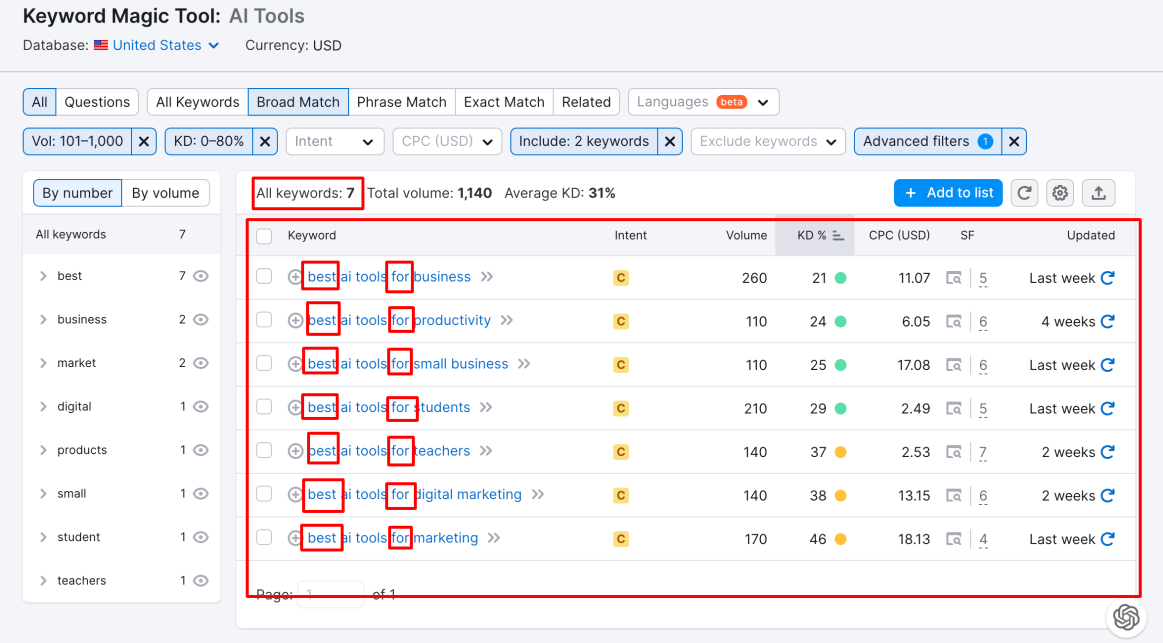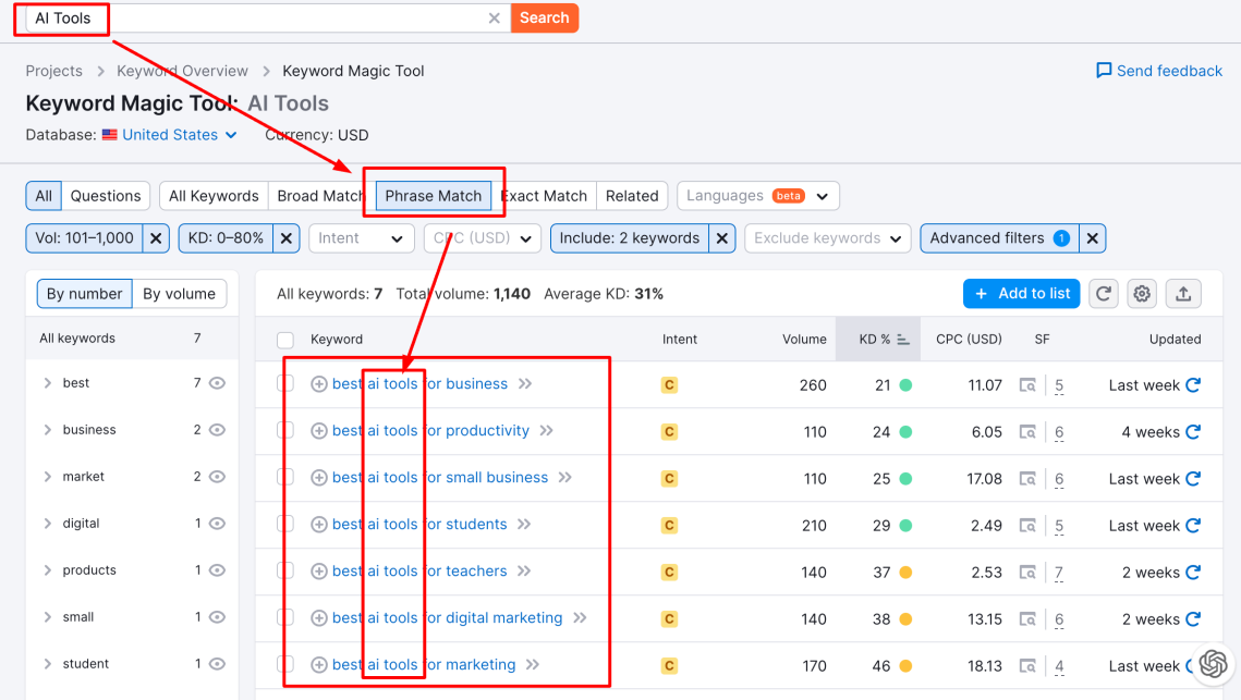 For example, my keyword is “AI tools,” when I used Phrase Match, I got long-tail keywords containing exact keyword phrases.