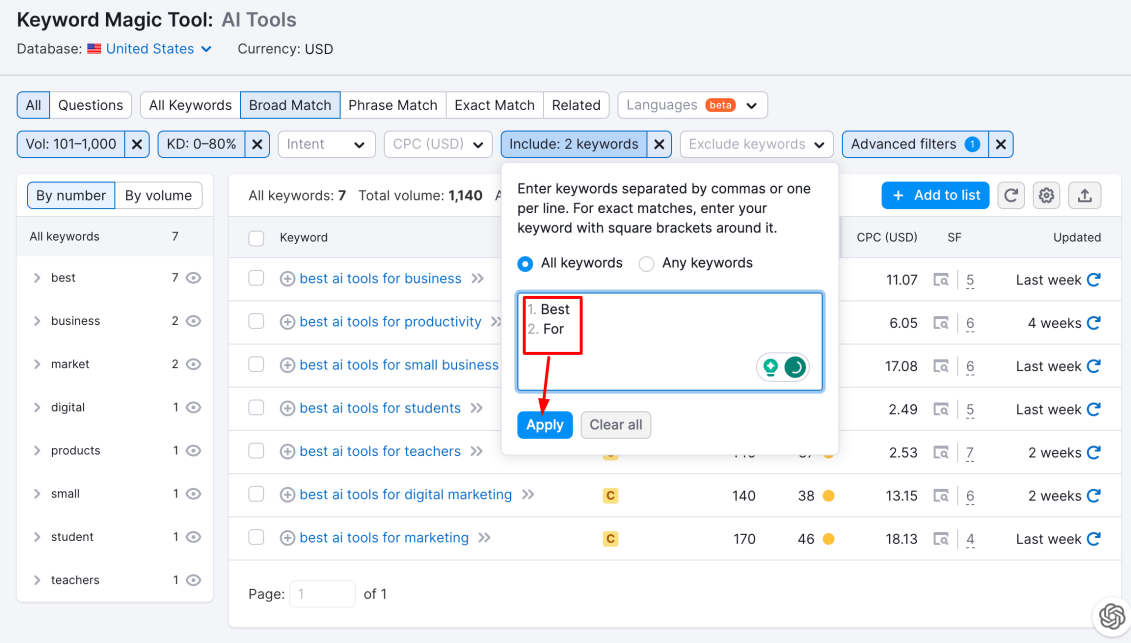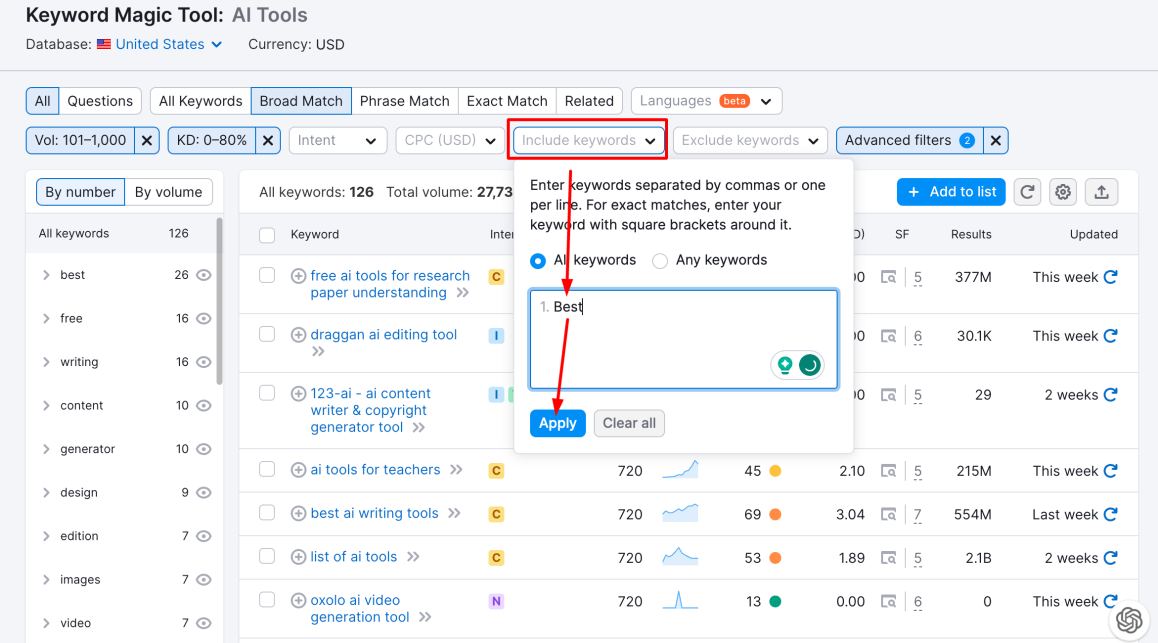 Moreover, to optimize keywords more densely, you can use more words in “include keywords.” For example, now I am using “For” with “Best” so that it will curate keywords like “Best AI Detection tools for….” and so on.