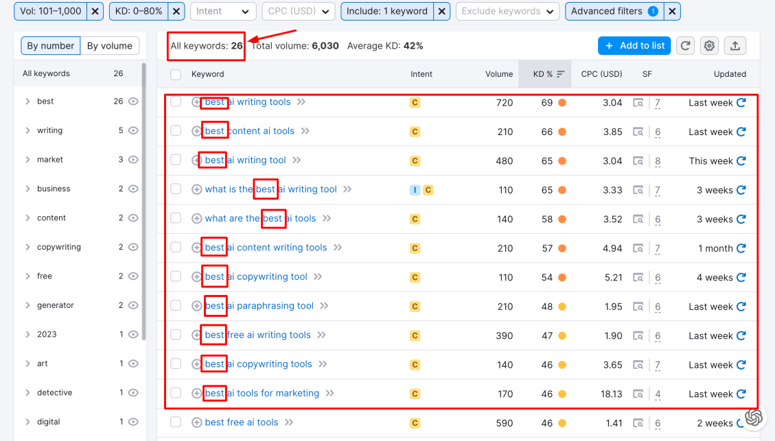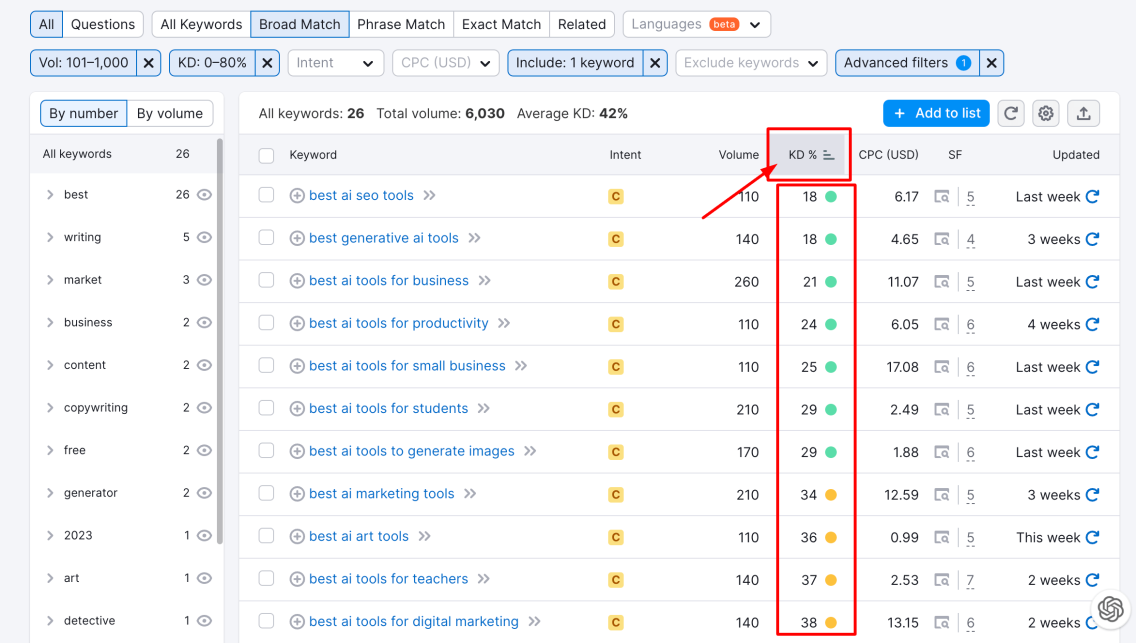 You can also see that SEMrush has extracted 26 long-tail keywords for your affiliate marketing content. Additionally, you can select the ‘KD%' column header to arrange the keyword results based on their difficulty.