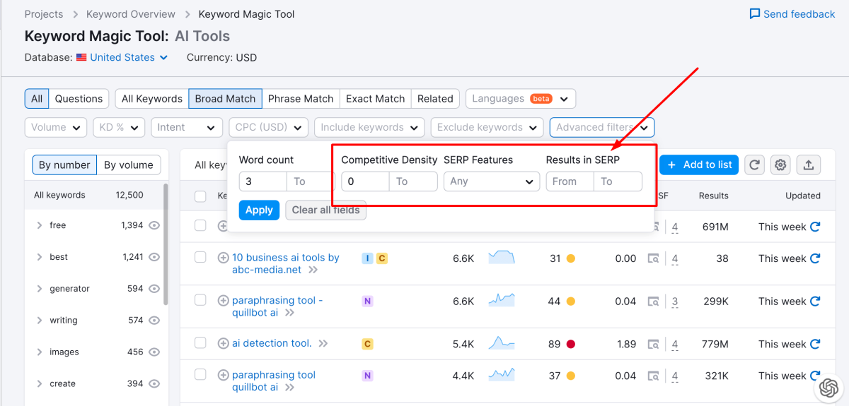 Explore other filters such as “Cost Per Click,” “Competitive Density,” and “SERP Features.” These filters provide insights into the profitability, competition, and additional ranking opportunities associated with the selected keywords.