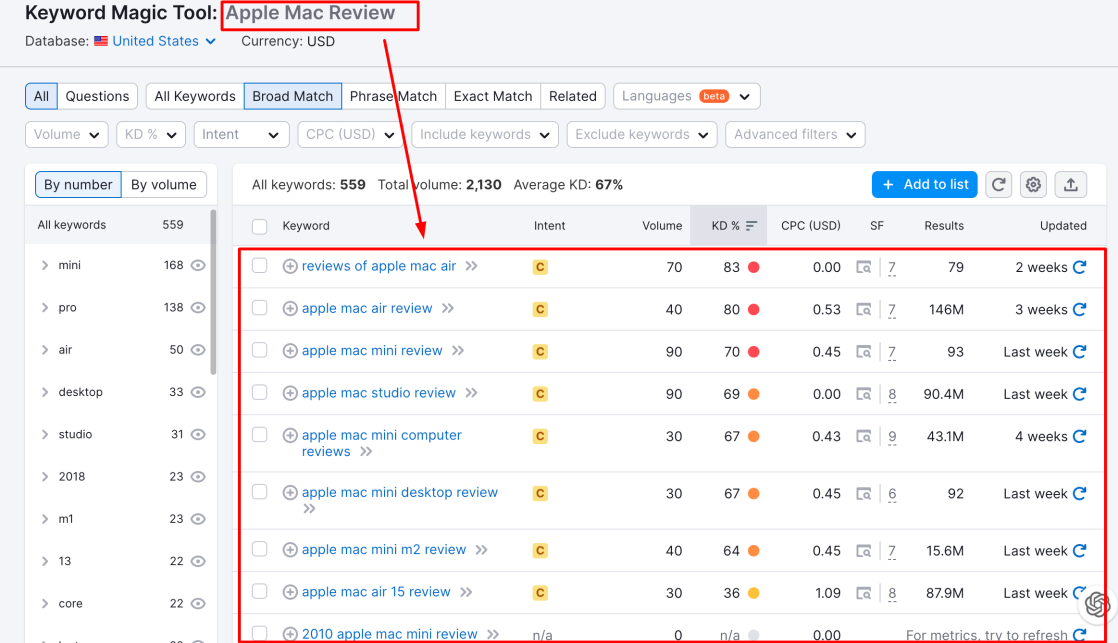 Review the results provided by the Keyword Magic Tool. Also, consider the average monthly search volume, projected difficulty score, and related keywords.