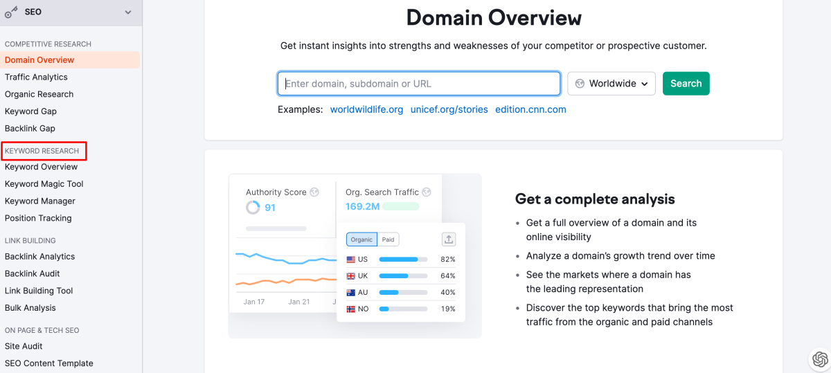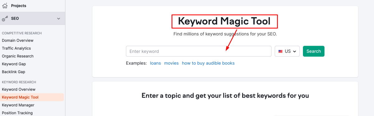 Navigate to SEMrush and access the “Keyword Analytics” submenu. For affiliate marketing keywords, focus on the “Keyword Magic” tool.