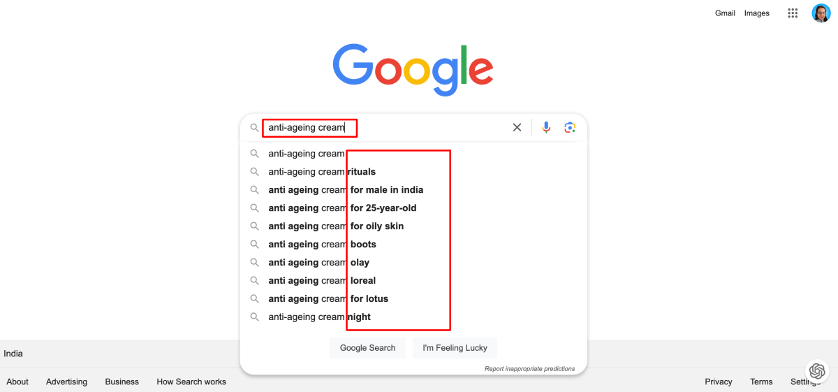 In that case, you'd target keywords like ‘anti-aging cream for oily skin' and ‘anti-aging cream for males' to capture the attention of users interested in these specific products.