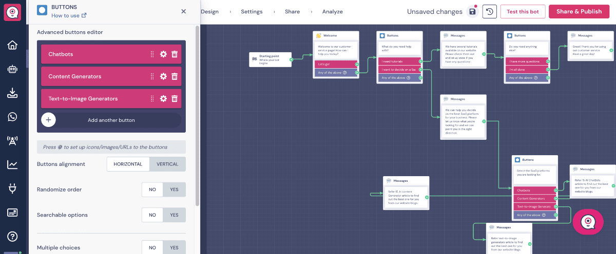 Then, I added a few buttons as per my requirement. My chatbot is a customer service chatbot that asks users about the SaaS platform's inquiries.