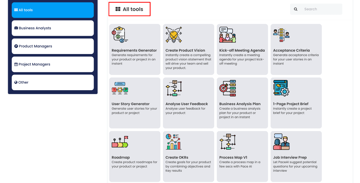 Pace AI gives you plenty of tools to choose from. Refer to the image below to check out some of them.