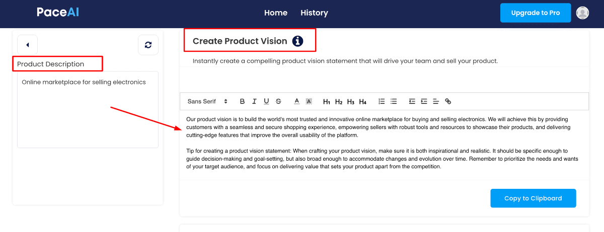 For one more instance, I selected “Create Product Vision.” I got the accurate results in seconds. Refer to the screenshot below.