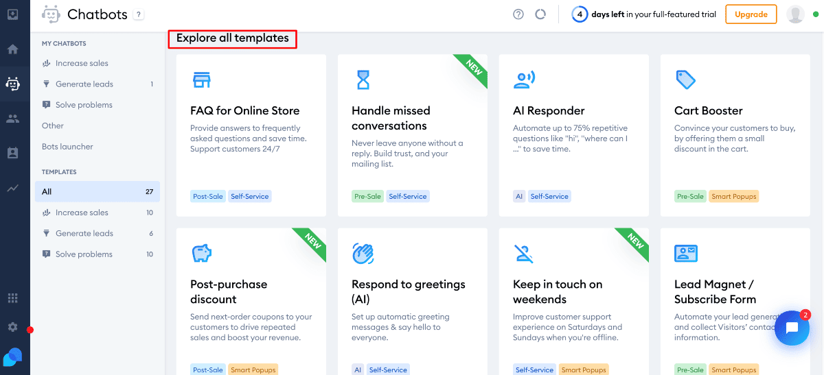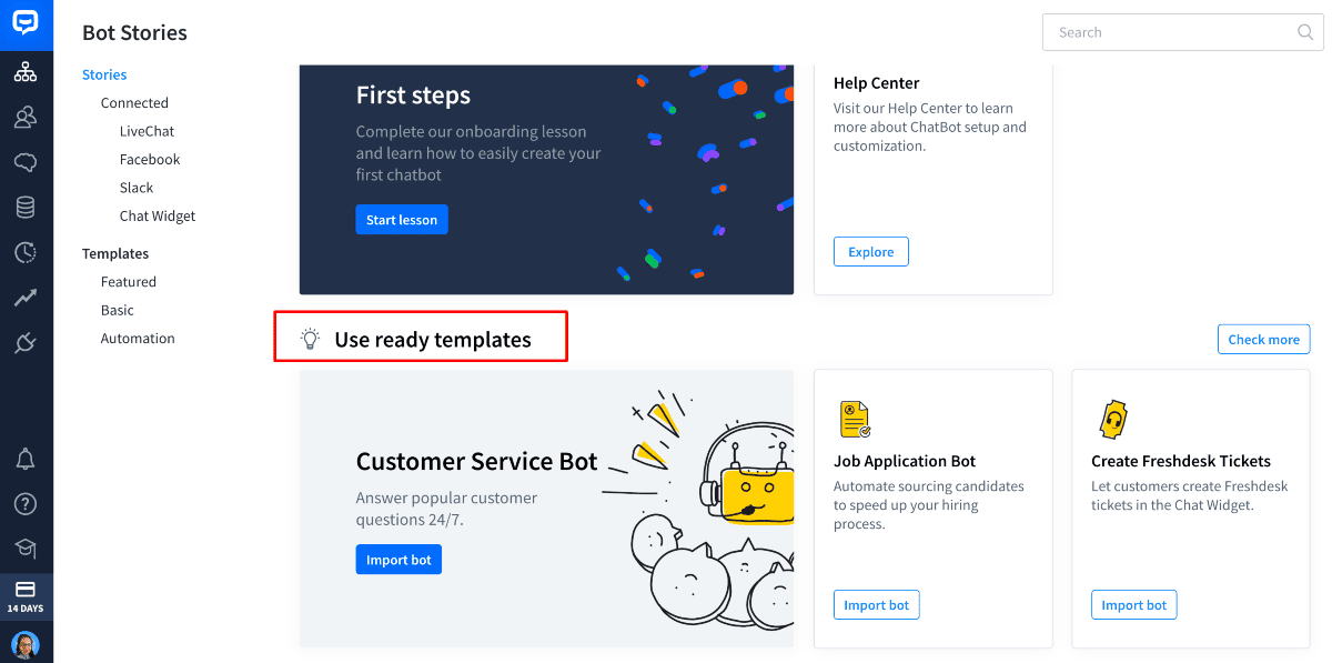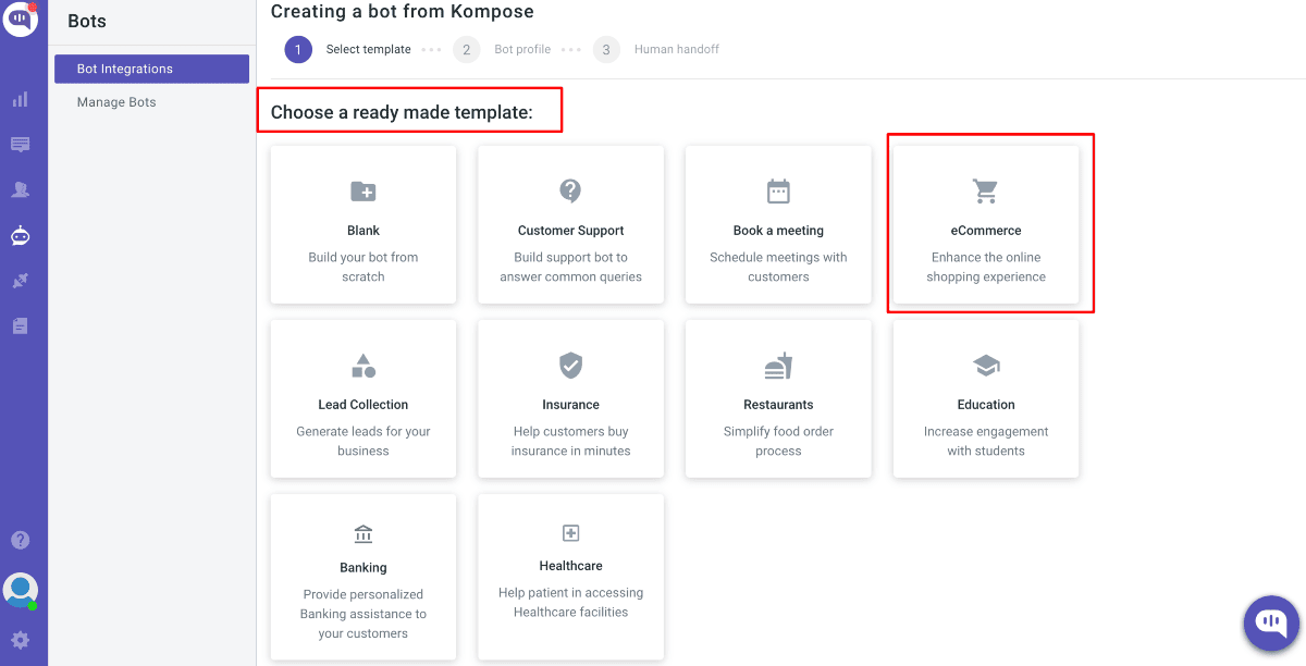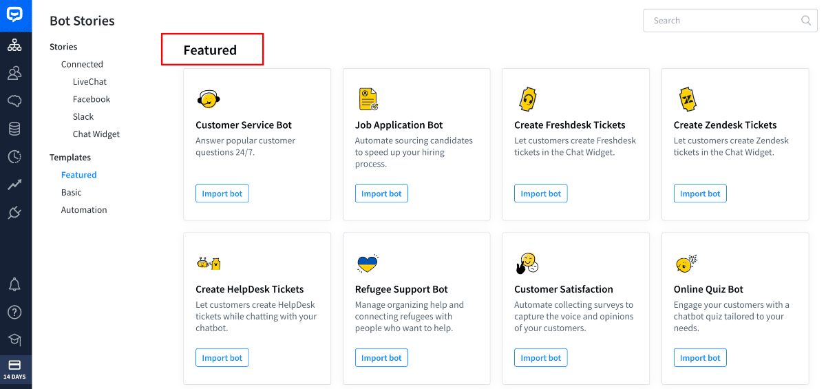 The image below shows all the templates. You can opt for any one of them to create your bot.