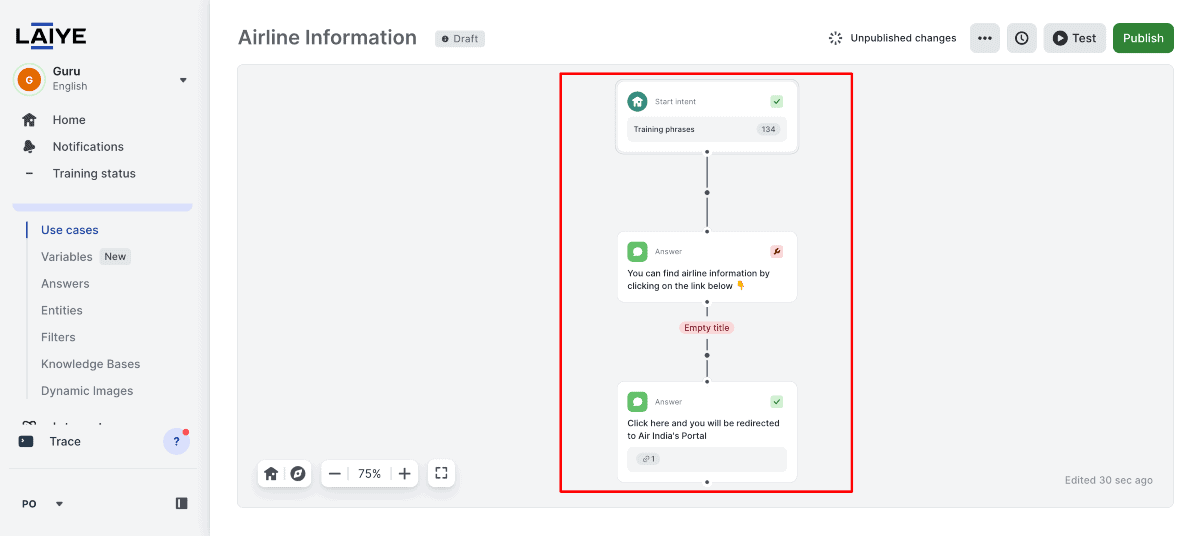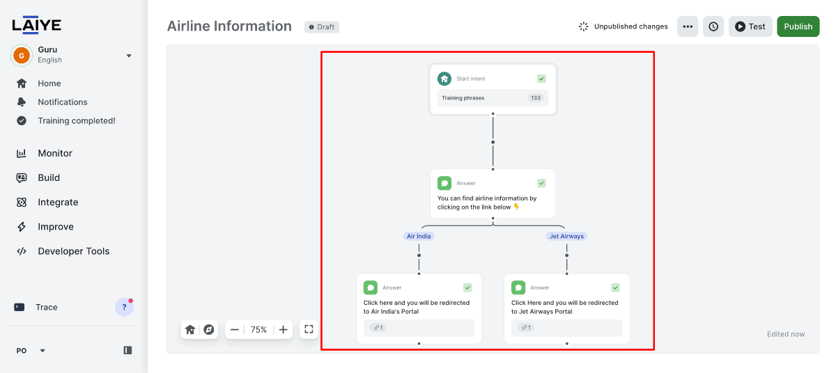 I named my bot “Guru,” I have selected the template “Airline Information” and clicked “Create your bot” to move forward.