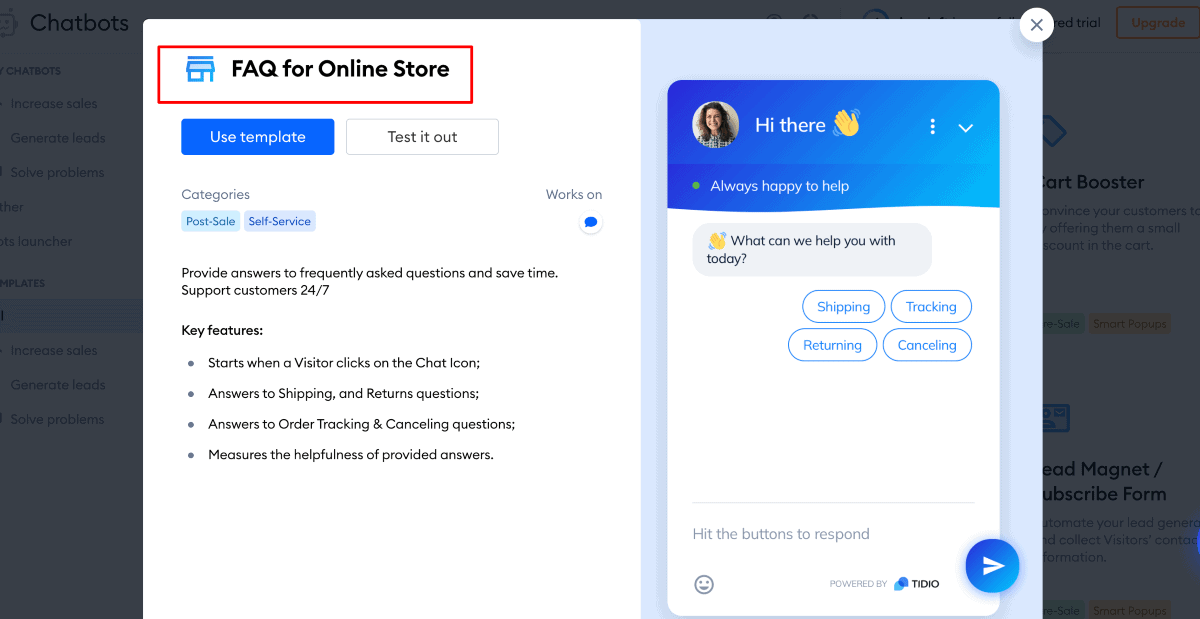 Tidio is a chatbot platform that empowers businesses to provide efficient customer support. The platform is super easy to use. Tidio helps businesses enhance online engagement. It improves customer satisfaction and drives business growth.