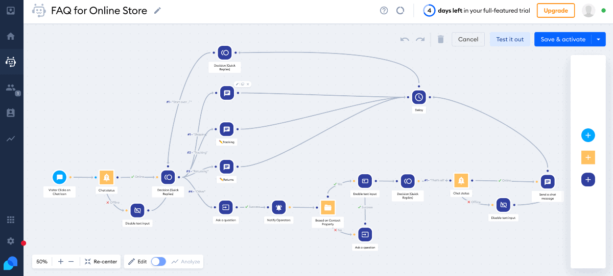 Additionally, Activechat empowers businesses to automate self-service processes. Through its intuitive interface, companies can create conversational flows. It guides customers through common inquiries or issues.