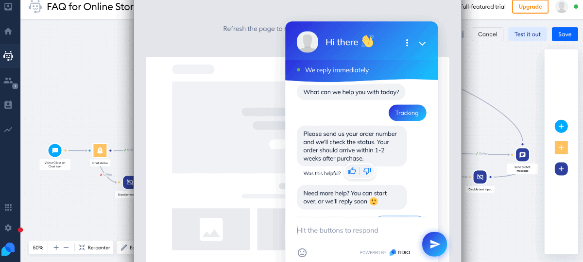 Tidio's artificial chatbot enables businesses to have interactive conversations with website visitors. The chatbot can handle many conversations at the same time. It provides instant responses to frequently asked questions. It can also transfer the conversation to a human operator when needed.