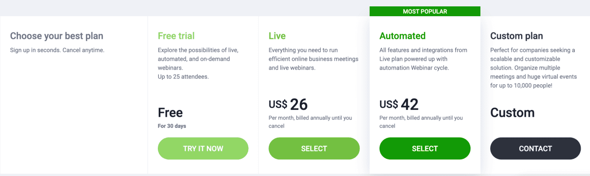 The least number of participants each package supports is 25, which can go up to 1000. However, with an increase in the number, there is also a price increase. These minimum subscription options cost as low as $26 per month for the Live deal and $42 per month for the Automated.