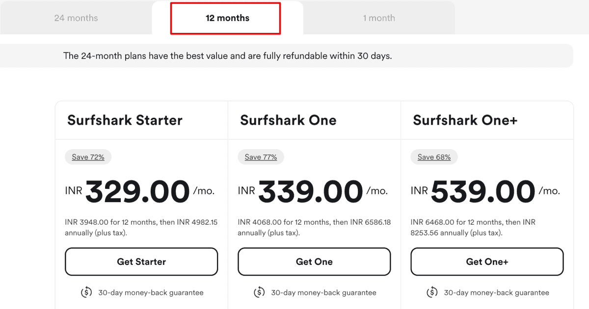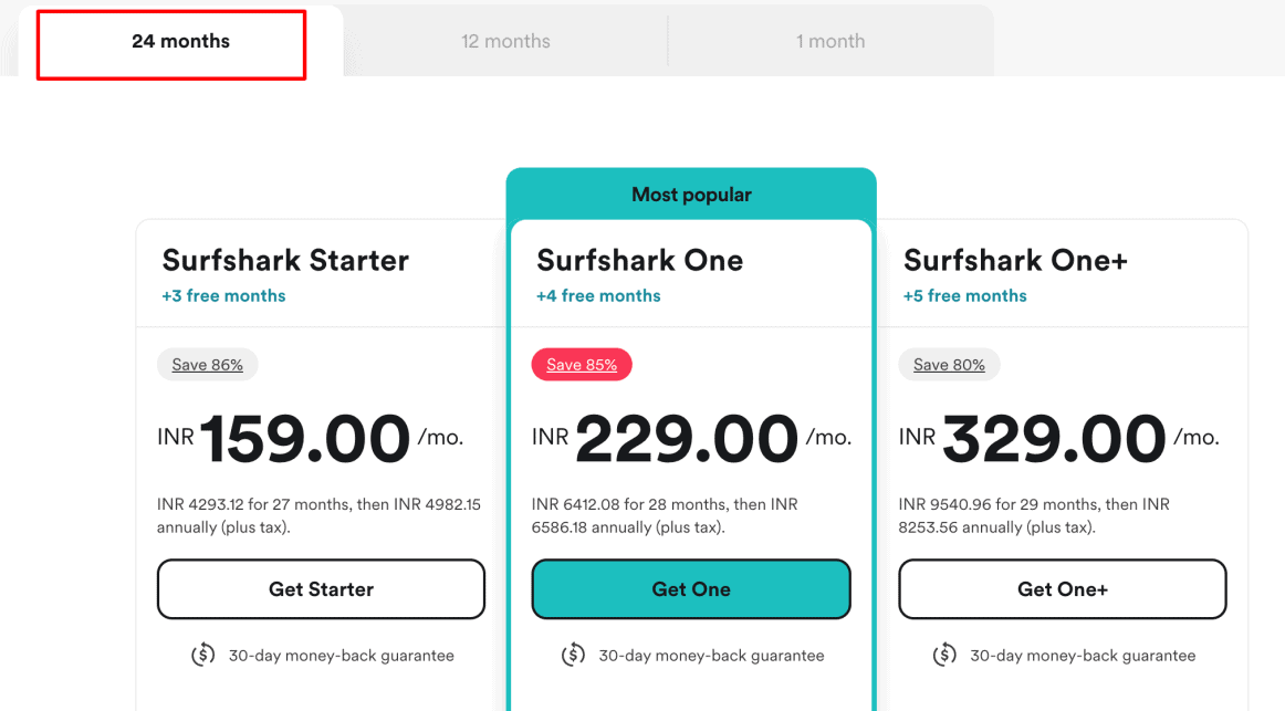 There are three plans in a one-month subscription plan as well. These plans are Starter, One, and One+. SurfShark does not offer any discount on one-month plans, so they are substantially costly.