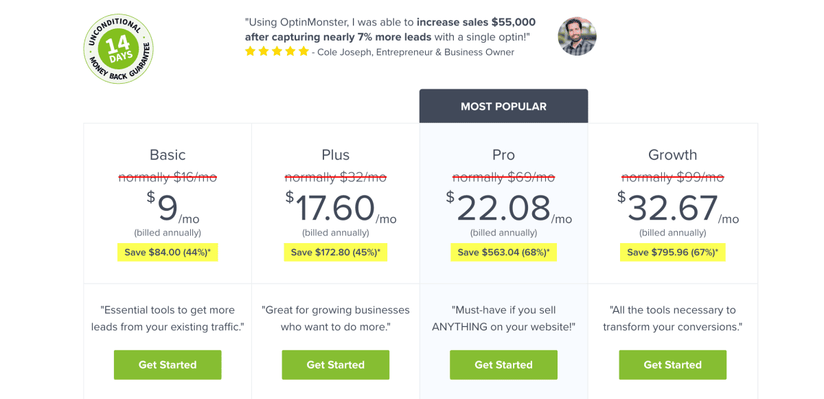 This plan is charged at $564 annually, which is equivalent to $22.08 a month. This is by far the most popular plan for OptinMonster!