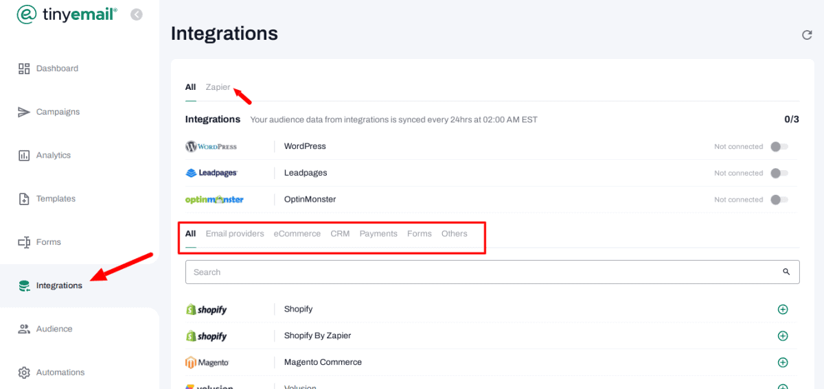 tinyEmail simplifies integration by automatically identifying the tools frequently used on your website. tinyEmail offers seamless integration with hundreds of applications and services through native and third-party connectors.