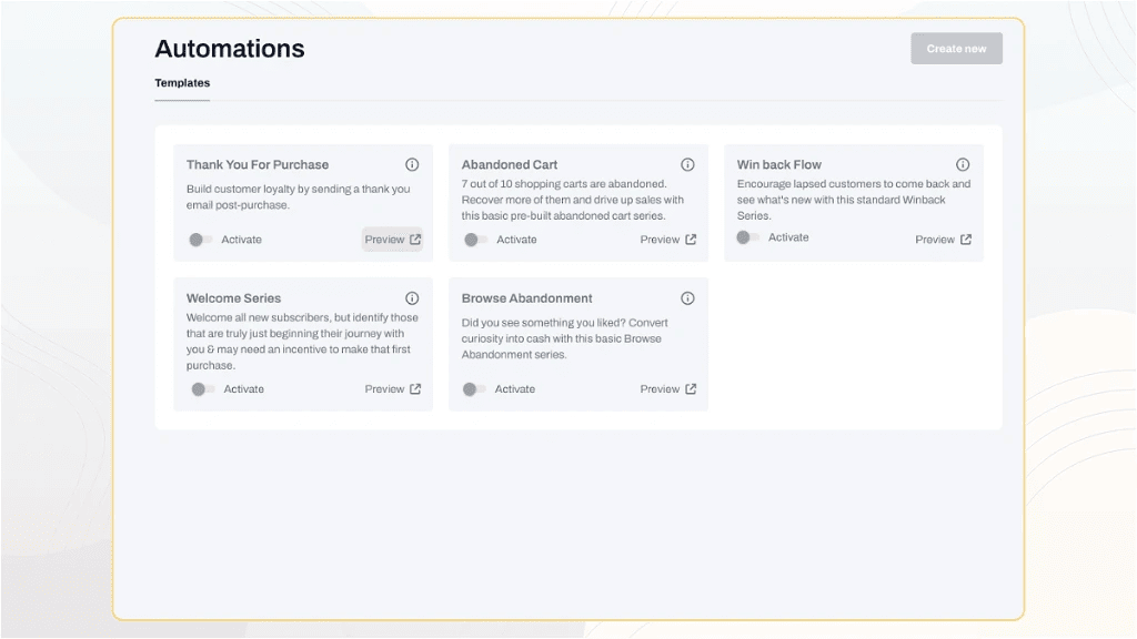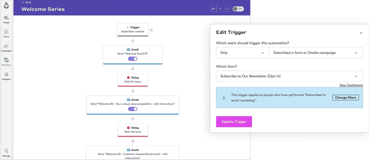 Drip empowers you to send personalized emails to your customers automatically, depending on their interactions with your emails. You can set up workflows and triggers to deliver relevant messages precisely when needed.