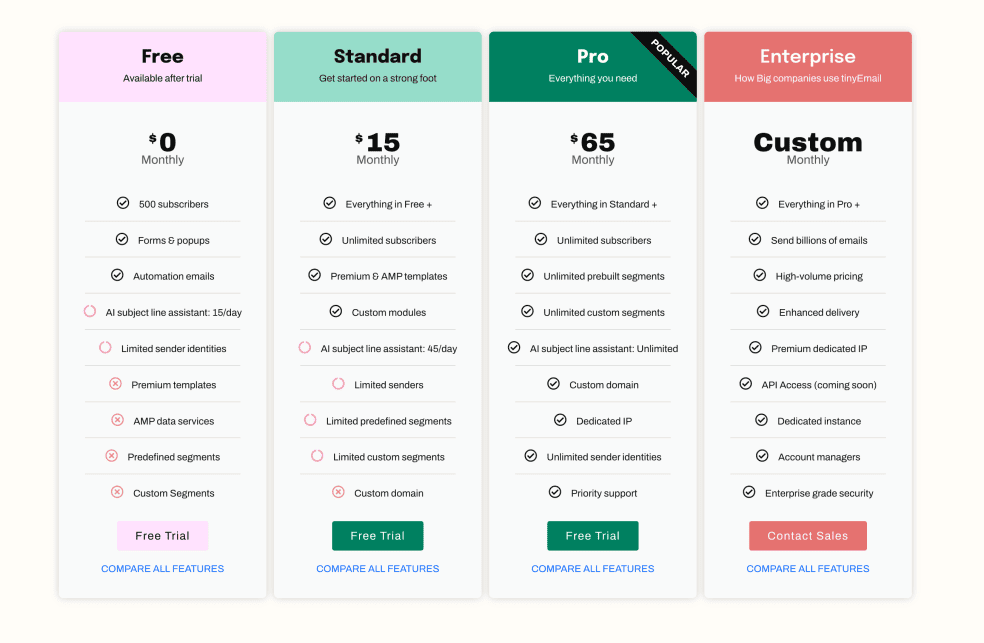 - Flexible Pricing: tinyEmail's tiered Pricing, including a free plan, accommodates various budgets and business needs.