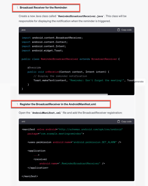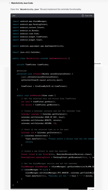 I asked ChatGPT that I am a beginner in creating Android Apps. I don't know much about Java Programming language. Please write code in Java to create an Android app that reminds users to attend meetings.