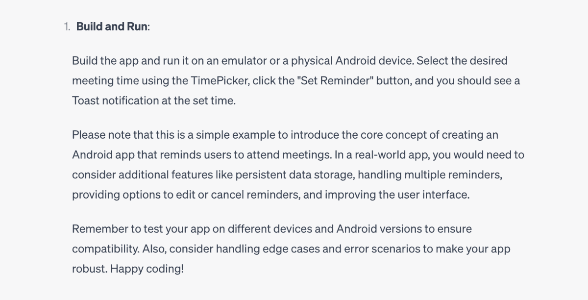 Further, ChatGPT also guides how to build the app and run it on an Android device.