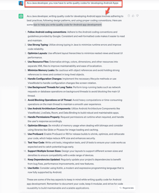 Next, I asked ChatGPT, “You now have to write quality codes for developing Android Apps with ChatGPT,” it gave me tips to write quality code for Android app development. Refer to the image below:
