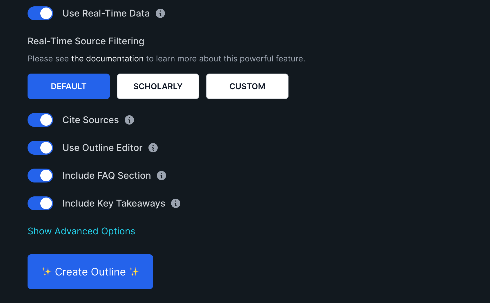 Source Citation, Custome Outline Builder, FAQ Generator, and many more. |