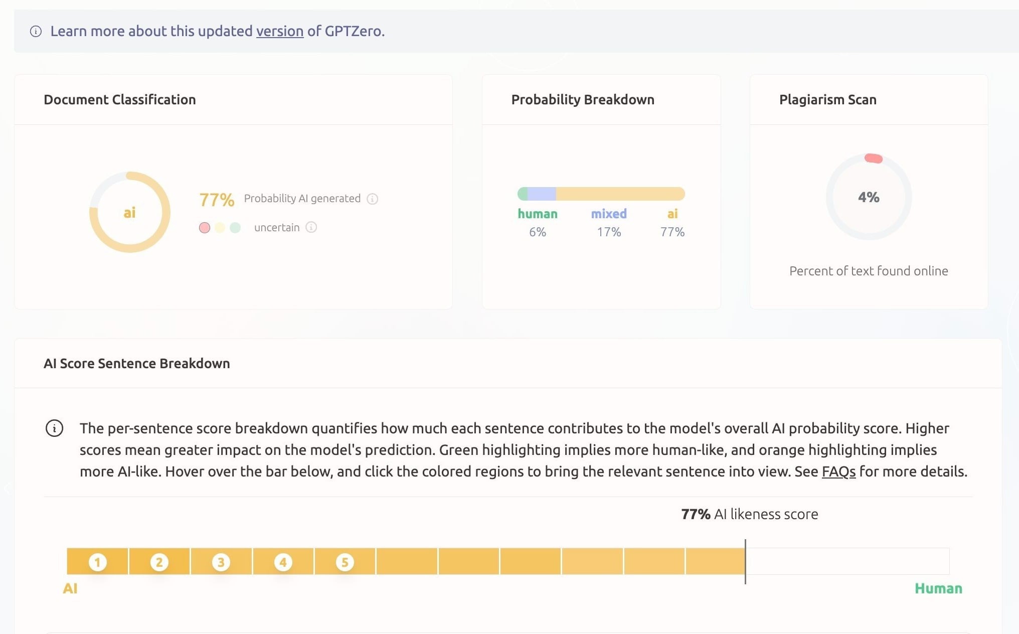 GPTZero shows the probability of AI-generated content to be 77% with a 4% weightage of plagiarism, which is unacceptable.