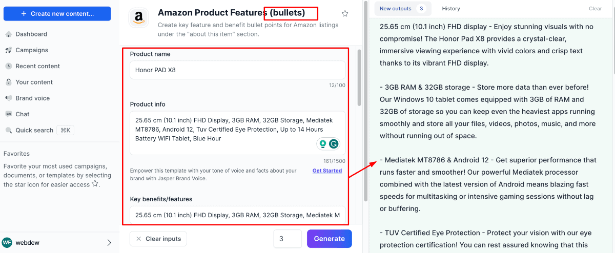 I chose the Amazon Product description template. The below image shows that I have given the Product name, feature, and tone of voice.