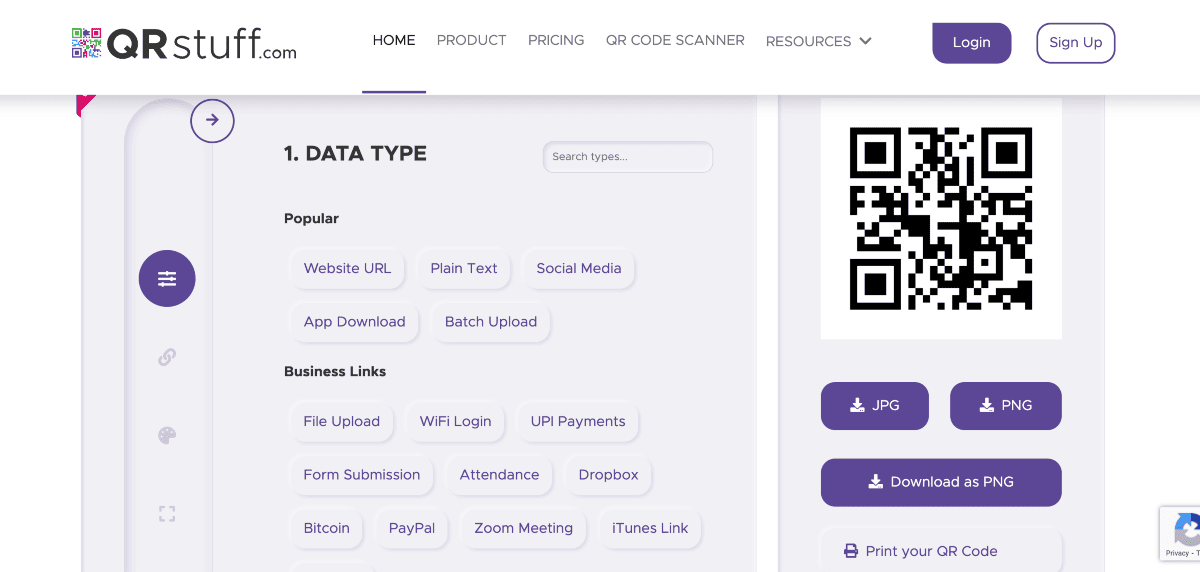 QR Stuff is one of the feature-rich QR code generators that offers all the essential functionalities, although some are locked for paid subscribers. It provides various unique QR code types along with conventional ones. Such unique types include Skype Calls, Attendance, iTunes Link, and Bitcoin.