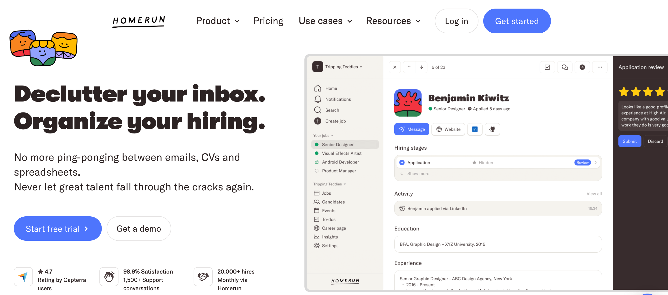 Homerun is a streamlined recruitment software that eliminates switching between emails, CVs, and spreadsheets. It offers a clear overview for smooth collaborative hiring. It thereby ensures that great talent never falls through the cracks again.