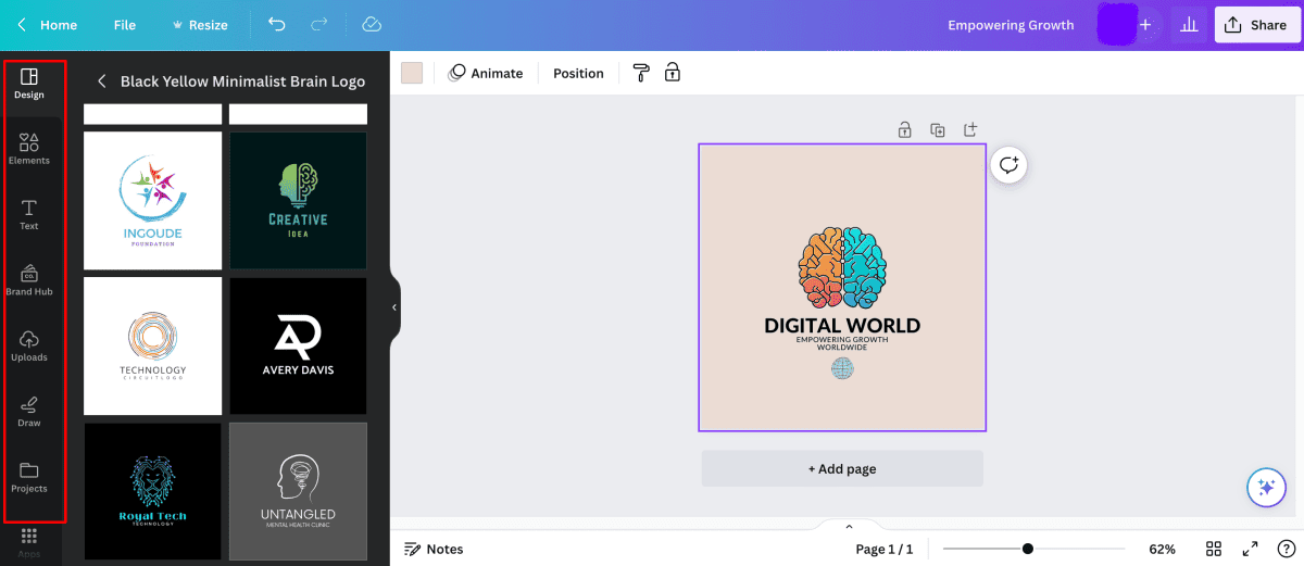 Canva also allows you to customize every aspect of your logo design. You can change colors and fonts within seconds. Also, it lets you adjust the size and positioning of elements.