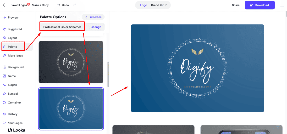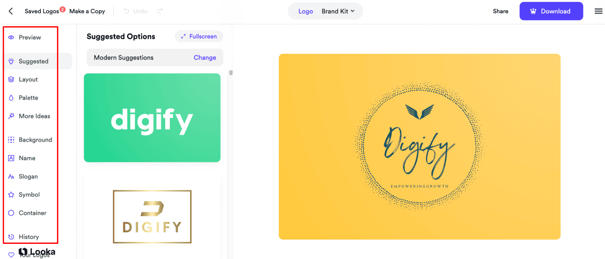 Looka's logo editor is easy to use. It lets you fine-tune your logo's colors, fonts, and layouts. You can experiment freely and undo any changes if necessary. Further, you can save the design once you have achieved your perfect logo.